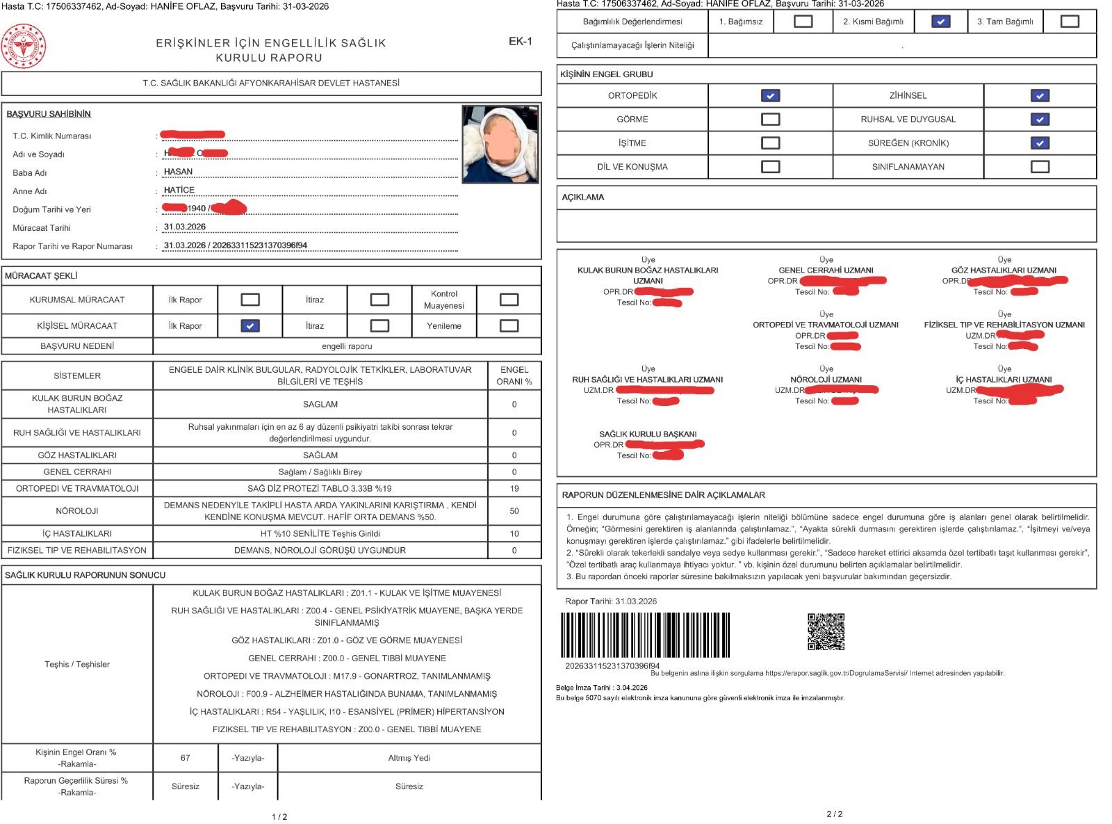 Engelli raporlarında ise aynı hasta “kısmen bağımlı.”